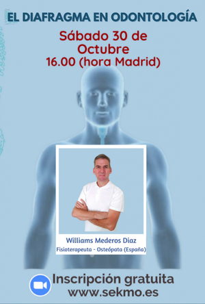 Acabamos el mes de octubre con una nueva cita con los Webinar de SEKMO, en esta ocación el Fisioterapeuta y Osteópata Willimans Mederos Diaz nos hablará sobre "El diafragma en Odontología", sin duda un tema muy interesante, no te lo pierdas, el evento se realizará a través de la plataforma Zoom a las 16h. hora peninsular.